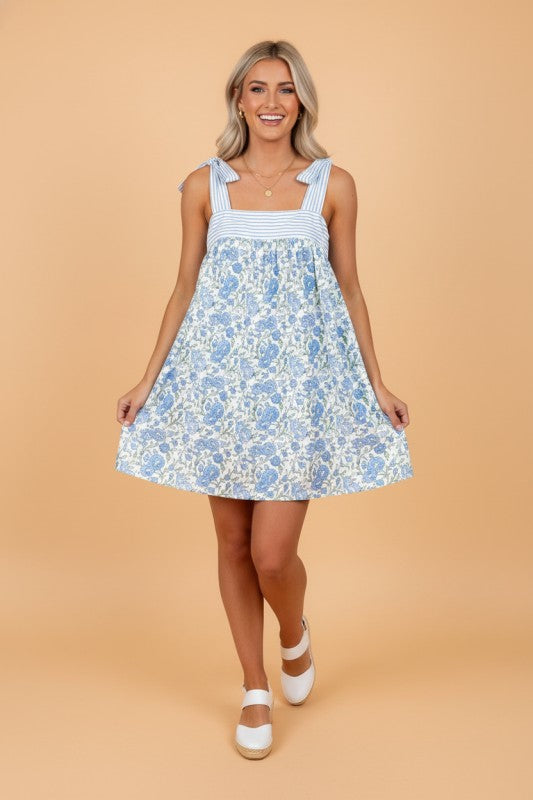 Embrace effortless summer style with this charming floral short dress. Featuring delicate floral prints paired with striped contrast panels, the playful bow straps add a sweet, feminine touch. Crafted from lightweight, breathable fabric, it drapes beautifully and keeps you cool on warm days. Perfect for beach getaways, garden picnics, or casual weekend adventures. A versatile wardrobe essential that transitions seamlessly from day to night. 100% Polyester