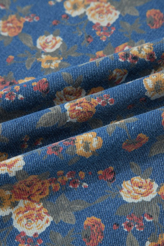 Embrace cozy charm this fall with denim overalls featuring vintage floral prints and delicate pleats throughout. Layer over a sheer long sleeve top for an effortlessly flattering look that transitions seamlessly from seasonal outings to relaxed days at home. Comfortable and stylish, this piece brings timeless appeal to your everyday wardrobe. Cotton/Polyester/Viscose