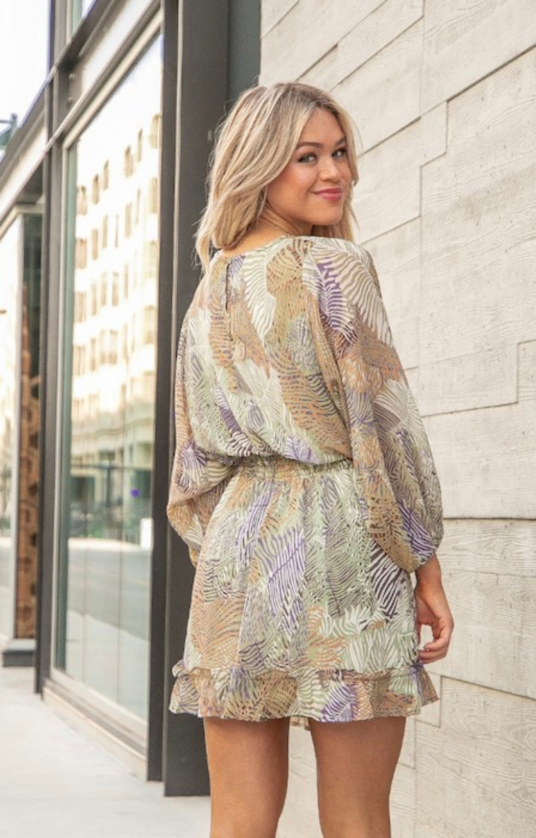 Print chiffon 2/3 sheer sleeve, smock waist detail fully lined dress
