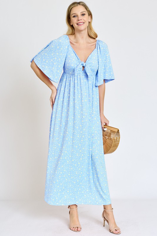 Floral Angel Sleeve Front Tie Maxi Dress
