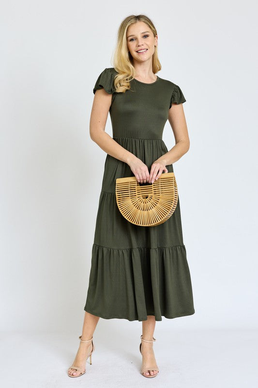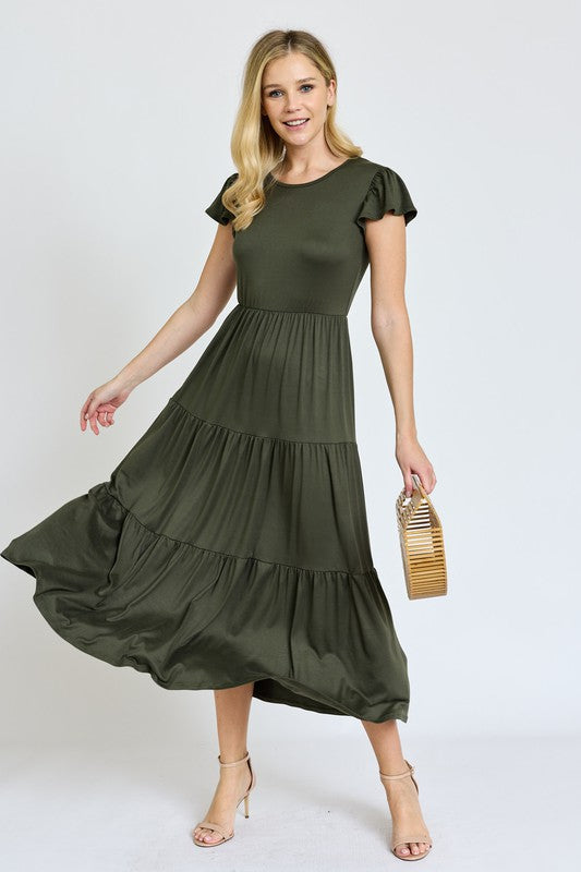 Solid Flutter Sleeve Tiered Tea Length Dress