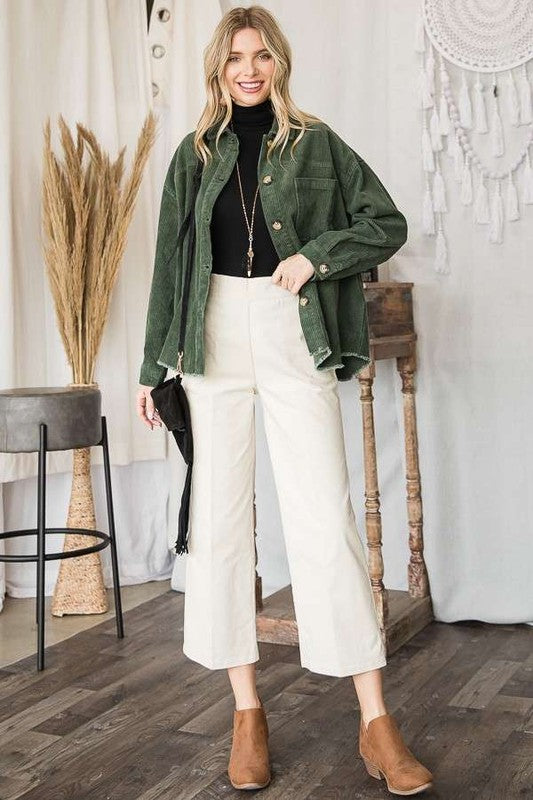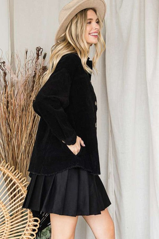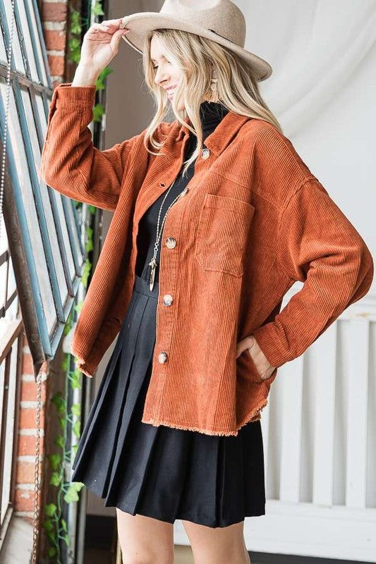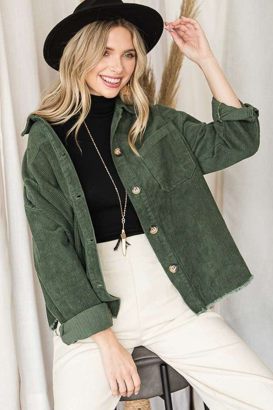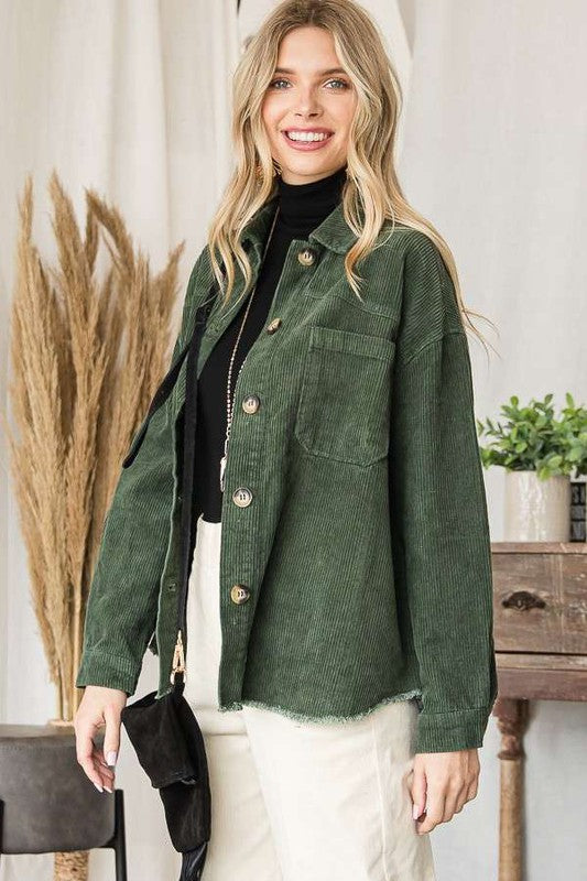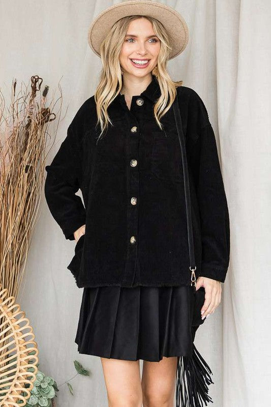 RIBBED VELVET, BUTTON UP, COLLARED, LONG SLEEVE OUTERWEAR WITH POCKETS