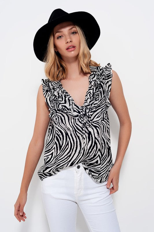 Top all-over zebra print with v-neck sheer chiffon light floaty fabric100% RayonRuns true to size.Regular Fit.